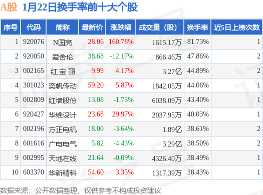 当日A股换手率前10大个股中5只个股收涨,平均涨幅40.83%,其中N国亮(920076)以换手率81.73%排第一,4只个股近5个交易日中多次上榜。