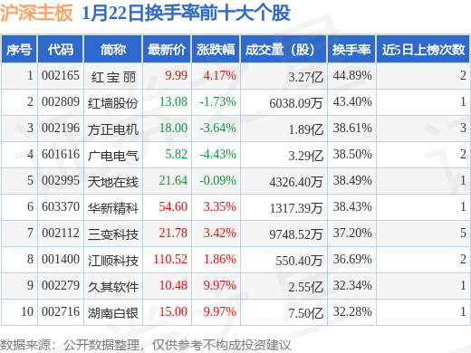当日沪深主板换手率前10大个股中6只个股收涨,平均涨幅5.46%,其中红 宝 丽(002165)以换手率44.89%排第一,5只个股近5个交易日中多次上榜。