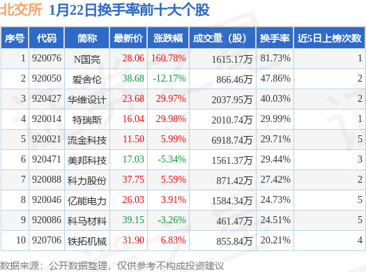 当日北交所换手率前10大个股中7只个股收涨,平均涨幅34.72%,其中N国亮(920076)以换手率81.73%排第一,8只个股近5个交易日中多次上榜。