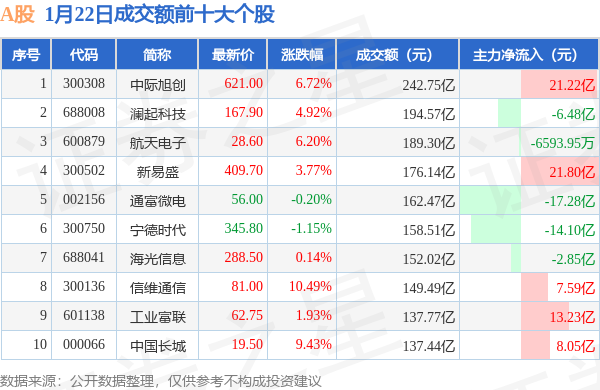 当日A股成交额前10大个股中8只个股收涨,平均涨幅5.45%,其中中际旭创(300308)以成交额242.75亿元排第一。从主力资金流入看,成交额前10大个股中有5只个股呈现主力资金净流入。