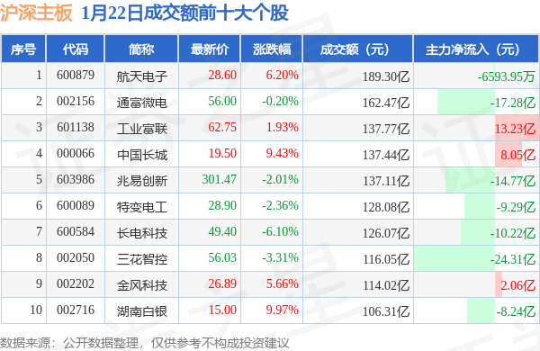 当日沪深主板成交额前10大个股中5只个股收涨,平均涨幅6.64%,其中航天电子(600879)以成交额189.3亿元排第一。从主力资金流入看,成交额前10大个股中有3只个股呈现主力资金净流入。