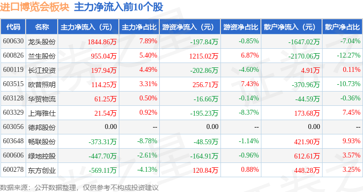 从资金流向上来看,当日进口博览会板块主力资金净流出2948.72万元,游资资金净流入2309.29万元,散户资金净流入639.43万元。进口博览会板块个股资金流向见下表:
