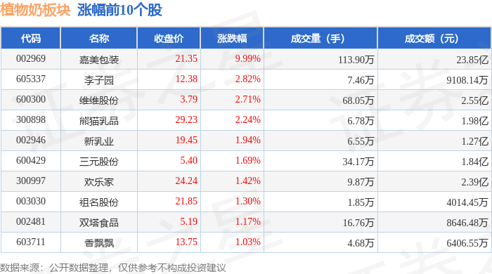 证券之星消息,1月22日植物奶板块较上一交易日上涨0.4%,嘉美包装领涨。当日上证指数报收于4122.58,上涨0.14%。深证成指报收于14327.05,上涨0.5%。植物奶板块个股涨跌见下表: