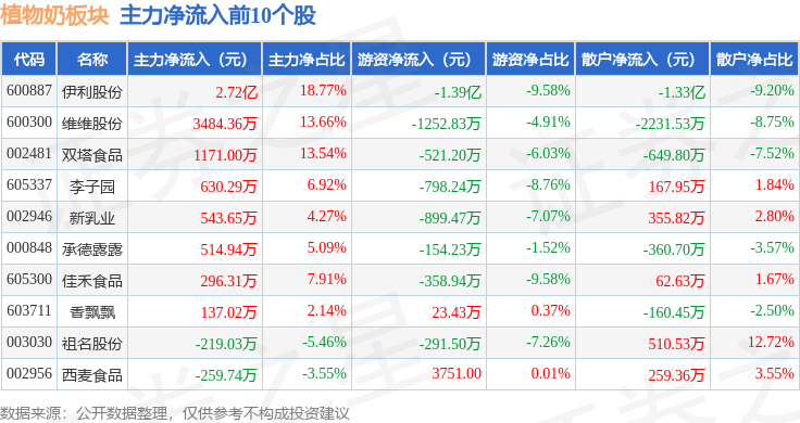 从资金流向上来看,当日植物奶板块主力资金净流入1.98亿元,游资资金净流出1.46亿元,散户资金净流出5251.26万元。植物奶板块个股资金流向见下表:
