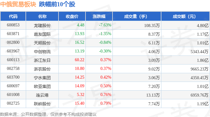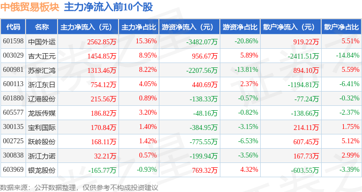 从资金流向上来看,当日中俄贸易板块主力资金净流出3796.56万元,游资资金净流出5550.43万元,散户资金净流入9346.98万元。中俄贸易板块个股资金流向见下表: