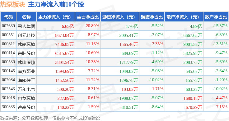 从资金流向上来看,当日热泵板块主力资金净流出17.56亿元,游资资金净流入2.5亿元,散户资金净流入15.06亿元。热泵板块个股资金流向见下表: