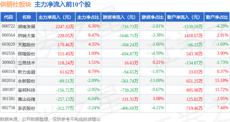 从资金流向上来看,当日供销社板块主力资金净流出5875.55万元,游资资金净流出6216.17万元,散户资金净流入1.21亿元。供销社板块个股资金流向见下表:
