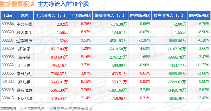 从资金流向上来看,当日数据要素板块主力资金净流入1.87亿元,游资资金净流入1155.19万元,散户资金净流出1.99亿元。数据要素板块个股资金流向见下表: