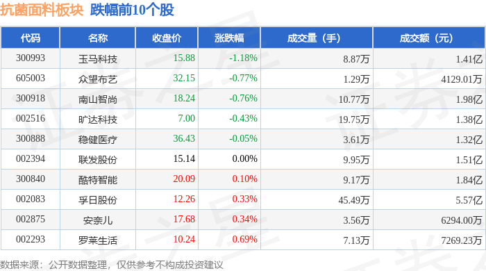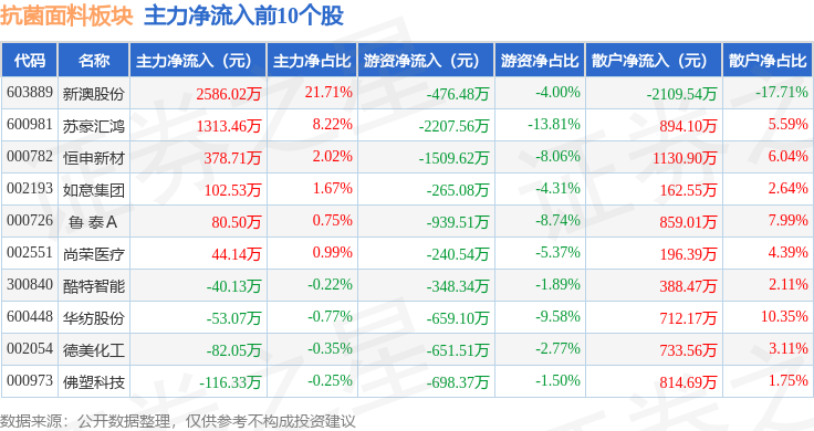 从资金流向上来看,当日抗菌面料板块主力资金净流出9359.17万元,游资资金净流出5899.89万元,散户资金净流入1.53亿元。抗菌面料板块个股资金流向见下表: