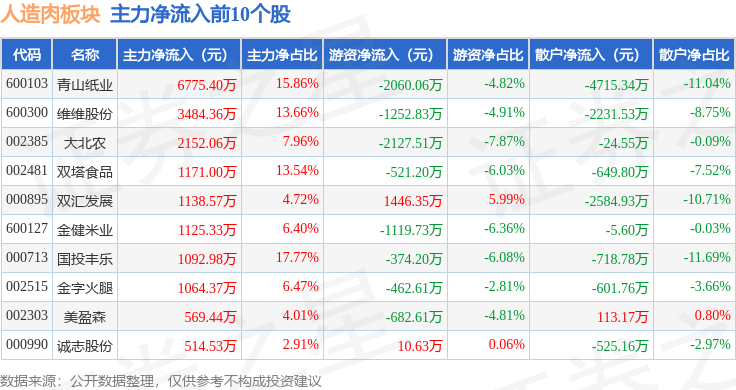 从资金流向上来看,当日人造肉板块主力资金净流出5740.36万元,游资资金净流出8128.71万元,散户资金净流入1.39亿元。人造肉板块个股资金流向见下表: