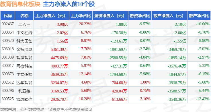 从资金流向上来看,当日教育信息化板块主力资金净流入5.55亿元,游资资金净流出2.86亿元,散户资金净流出2.69亿元。教育信息化板块个股资金流向见下表: