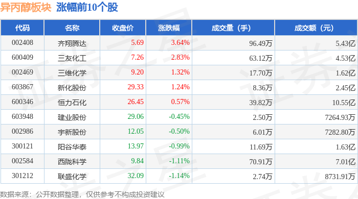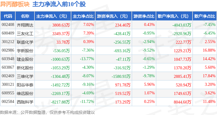 从资金流向上来看,当日异丙醇板块主力资金净流出9.0亿元,游资资金净流入3.18亿元,散户资金净流入5.82亿元。异丙醇板块个股资金流向见下表:
