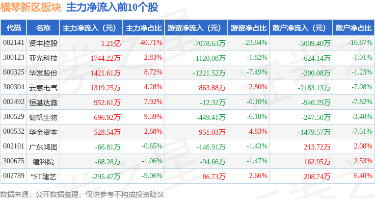 从资金流向上来看,当日横琴新区板块主力资金净流出1.42亿元,游资资金净流出1751.64万元,散户资金净流入1.6亿元。横琴新区板块个股资金流向见下表: