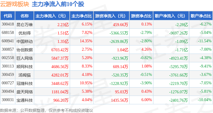 从资金流向上来看,当日云游戏板块主力资金净流出2.59亿元,游资资金净流入4.94亿元,散户资金净流出2.35亿元。云游戏板块个股资金流向见下表: