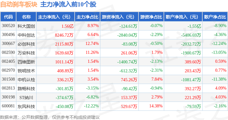 从资金流向上来看,当日自动刹车板块主力资金净流出4.87亿元,游资资金净流入2.27亿元,散户资金净流入2.6亿元。自动刹车板块个股资金流向见下表: