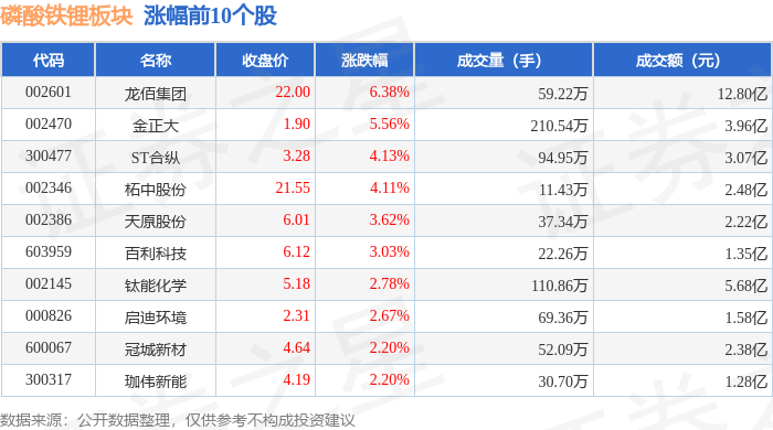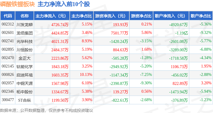 从资金流向上来看,当日磷酸铁锂板块主力资金净流出40.18亿元,游资资金净流入8.05亿元,散户资金净流入32.13亿元。磷酸铁锂板块个股资金流向见下表: