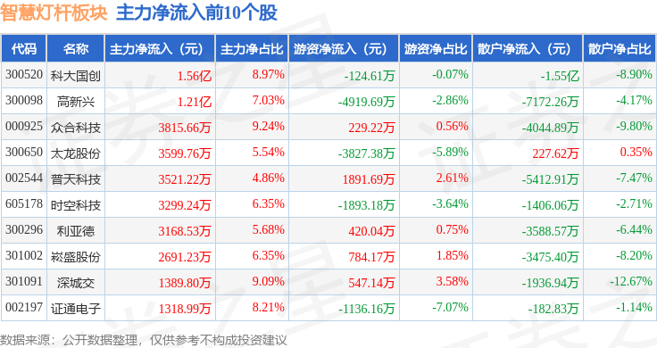 从资金流向上来看,当日智慧灯杆板块主力资金净流出7384.77万元,游资资金净流入8729.2万元,散户资金净流出1344.43万元。智慧灯杆板块个股资金流向见下表: