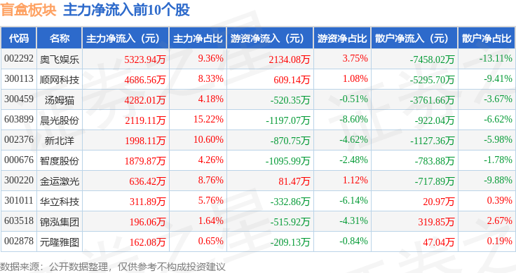 从资金流向上来看,当日盲盒板块主力资金净流入2000.2万元,游资资金净流入9331.5万元,散户资金净流出1.13亿元。盲盒板块个股资金流向见下表: