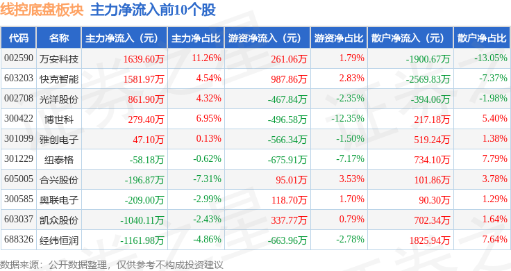 从资金流向上来看,当日线控底盘板块主力资金净流出3.61亿元,游资资金净流入1880.67万元,散户资金净流入3.42亿元。线控底盘板块个股资金流向见下表:
