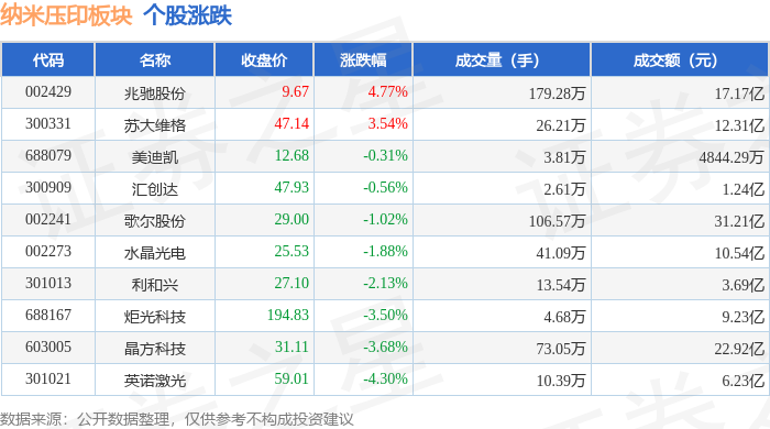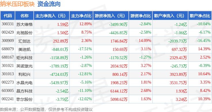 从资金流向上来看,当日纳米压印板块主力资金净流出4.57亿元,游资资金净流入8786.28万元,散户资金净流入3.7亿元。纳米压印板块个股资金流向见下表:
