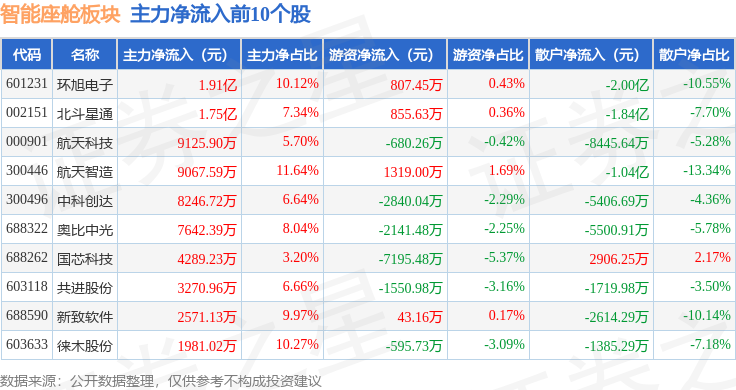 从资金流向上来看,当日智能座舱板块主力资金净流出11.65亿元,游资资金净流入8.39亿元,散户资金净流入3.26亿元。智能座舱板块个股资金流向见下表: