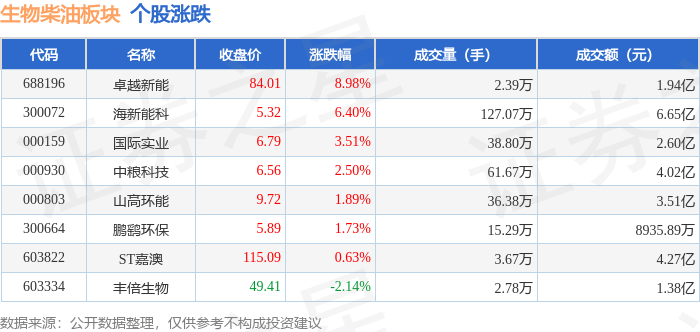 证券之星消息,1月22日生物柴油板块较上一交易日上涨3.93%,卓越新能领涨。当日上证指数报收于4122.58,上涨0.14%。深证成指报收于14327.05,上涨0.5%。生物柴油板块个股涨跌见下表: