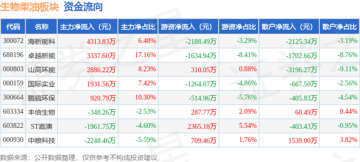 从资金流向上来看,当日生物柴油板块主力资金净流入8831.53万元,游资资金净流出1929.99万元,散户资金净流出6901.54万元。生物柴油板块个股资金流向见下表: