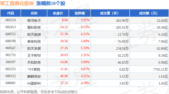 从资金流向上来看,当日军工信息化板块主力资金净流入18.51亿元,游资资金净流出2534.87万元,散户资金净流出18.25亿元。军工信息化板块个股资金流向见下表: