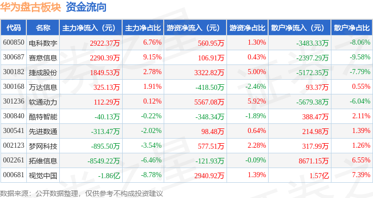 从资金流向上来看,当日华为盘古板块主力资金净流出2.09亿元,游资资金净流入1.23亿元,散户资金净流入8607.74万元。华为盘古板块个股资金流向见下表: