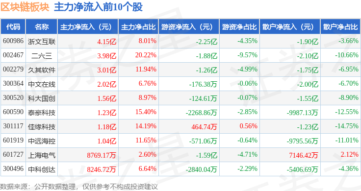 从资金流向上来看,当日区块链板块主力资金净流出10.87亿元,游资资金净流出10.71亿元,散户资金净流入21.59亿元。区块链板块个股资金流向见下表: