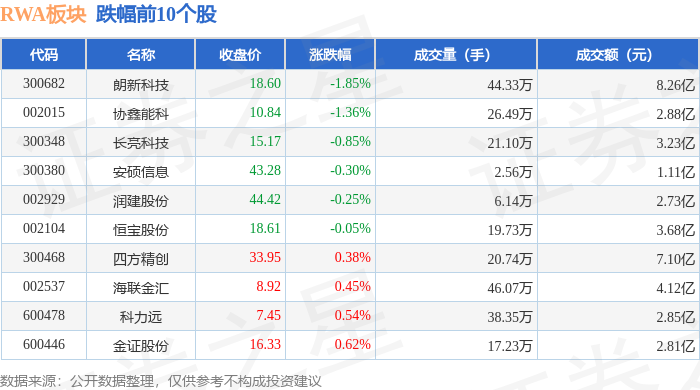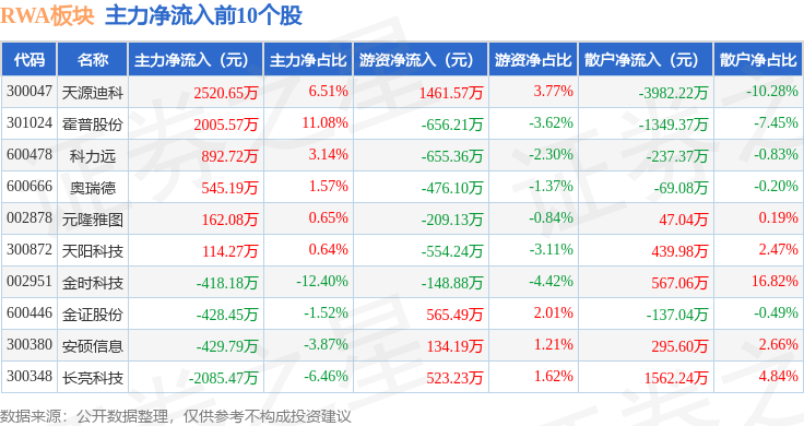 从资金流向上来看,当日RWA板块主力资金净流出1.94亿元,游资资金净流入4538.13万元,散户资金净流入1.48亿元。RWA板块个股资金流向见下表: