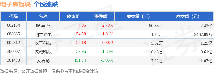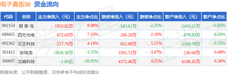 从资金流向上来看,当日电子鼻板块主力资金净流出1.13亿元,游资资金净流入8078.84万元,散户资金净流入3186.24万元。电子鼻板块个股资金流向见下表: