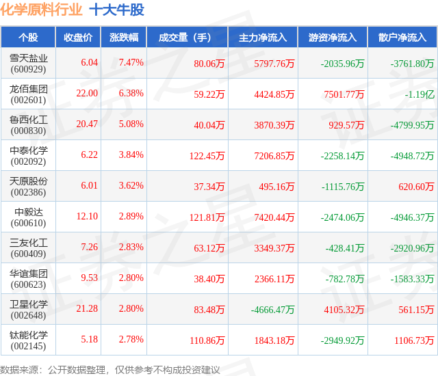 个股表现方面,化学原料行业当日领涨股为雪天盐业(600929),该股当日报收6.04,上涨7.47%,成交量80.06万,主力资金净流入5797.76万元。龙佰集团(002601)以上涨6.38%紧随其后,该股当日成交量59.22万,主力资金净流入4424.85万元。除此之外,鲁西化工(000830)、中泰化学(002092)、天原股份(002386)均进入当日牛股之列。具体个股列表见下表: