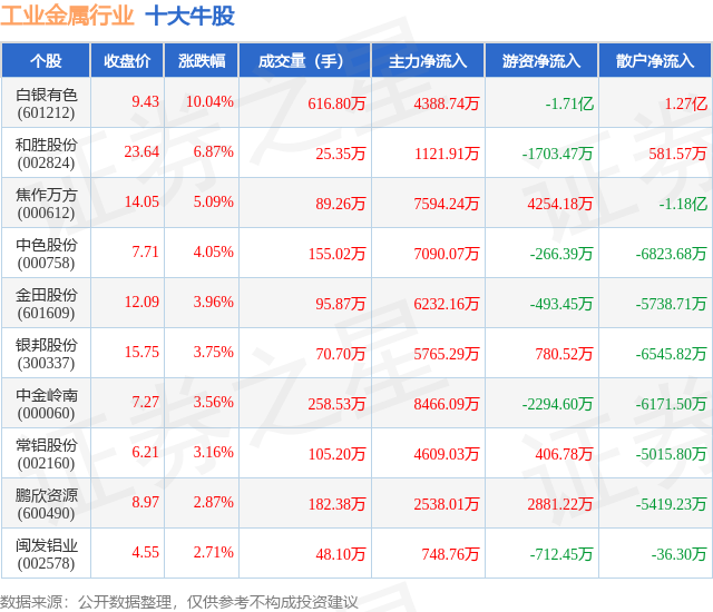 个股表现方面,工业金属行业当日领涨股为白银有色(601212),该股当日报收9.43,上涨10.04%,成交量616.8万,主力资金净流入4388.74万元。和胜股份(002824)以上涨6.87%紧随其后,该股当日成交量25.35万,主力资金净流入1121.91万元。除此之外,焦作万方(000612)、中色股份(000758)、金田股份(601609)均进入当日牛股之列。具体个股列表见下表: