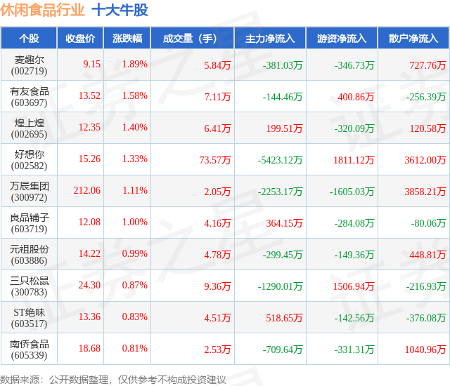 个股表现方面,休闲食品行业当日领涨股为麦趣尔(002719),该股当日报收9.15,上涨1.89%,成交量5.84万,主力资金净流出381.03万元。有友食品(603697)以上涨1.58%紧随其后,该股当日成交量7.11万,主力资金净流出144.46万元。除此之外,煌上煌(002695)、好想你(002582)、万辰集团(300972)均进入当日牛股之列。具体个股列表见下表: