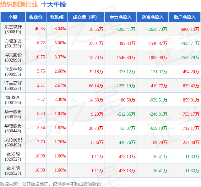 个股表现方面,纺织制造行业当日领涨股为聚杰微纤(300819),该股当日报收40.85,上涨8.04%,成交量18.55万,主力资金净流出4203.41万元。百隆东方(601339)以上涨5.0%紧随其后,该股当日成交量25.01万,主力资金净流入392.84万元。除此之外,浔兴股份(002098)、欣龙控股(000955)、江南高纤(600527)均进入当日牛股之列。具体个股列表见下表: