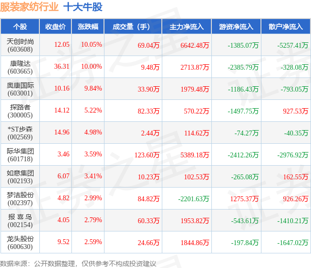 个股表现方面,服装家纺行业当日领涨股为天创时尚(603608),该股当日报收12.05,上涨10.05%,成交量69.04万,主力资金净流入6642.48万元。康隆达(603665)以上涨10.0%紧随其后,该股当日成交量9.48万,主力资金净流入2713.87万元。除此之外,奥康国际(603001)、探路者(300005)、*ST步森(002569)均进入当日牛股之列。具体个股列表见下表: