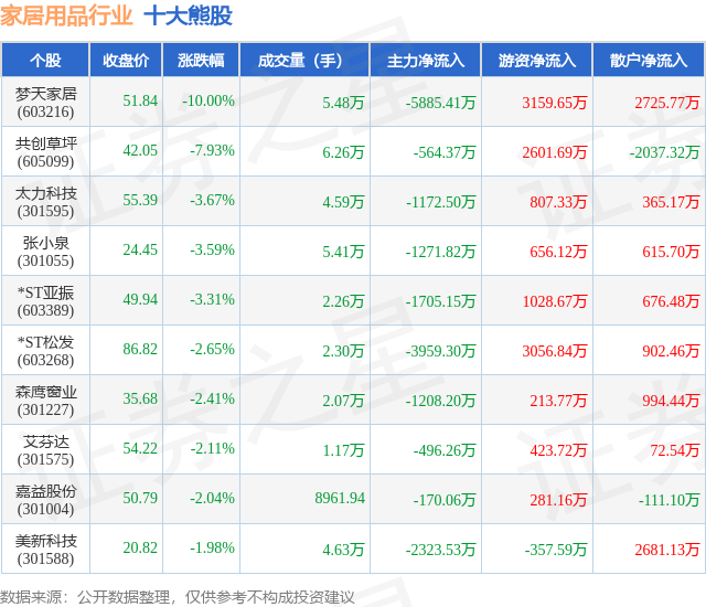 个股表现方面,家居用品行业当日领跌股为梦天家居(603216),该股当日报收51.84,下跌10.0%,成交量5.48万,主力资金净流出5885.41万元。共创草坪(605099)以下跌7.93%紧随其后,该股当日成交量6.26万,主力资金净流出564.37万元。除此之外,太力科技(301595)、张小泉(301055)、*ST亚振(603389)均进入当日熊股之列。具体个股列表见下表: