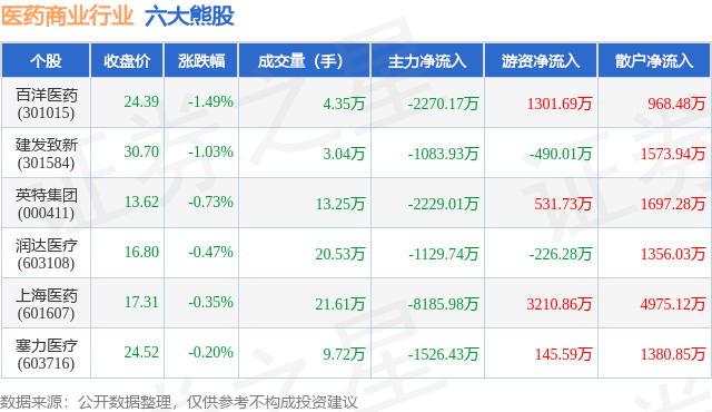 个股表现方面,医药商业行业当日领跌股为百洋医药(301015),该股当日报收24.39,下跌1.49%,成交量4.35万,主力资金净流出2270.17万元。建发致新(301584)以下跌1.03%紧随其后,该股当日成交量3.04万,主力资金净流出1083.93万元。除此之外,英特集团(000411)、润达医疗(603108)、上海医药(601607)均进入当日熊股之列。具体个股列表见下表: