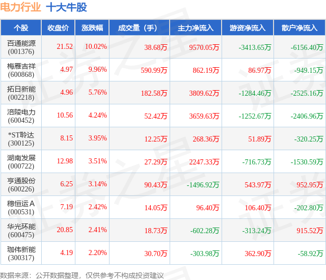 个股表现方面,电力行业当日领涨股为百通能源(001376),该股当日报收21.52,上涨10.02%,成交量38.68万,主力资金净流入9570.05万元。梅雁吉祥(600868)以上涨9.96%紧随其后,该股当日成交量590.99万,主力资金净流入862.19万元。除此之外,拓日新能(002218)、涪陵电力(600452)、*ST聆达(300125)均进入当日牛股之列。具体个股列表见下表:
