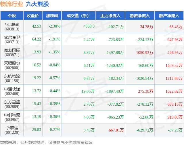 个股表现方面,物流行业当日领跌股为*ST原尚(603813),该股当日报收42.53,下跌2.3%,成交量4660.0,主力资金净流出102.71万元。密尔克卫(603713)以下跌1.91%紧随其后,该股当日成交量2.47万,主力资金净流出723.83万元。除此之外,嘉友国际(603871)、天顺股份(002800)、东航物流(601156)均进入当日熊股之列。具体个股列表见下表: