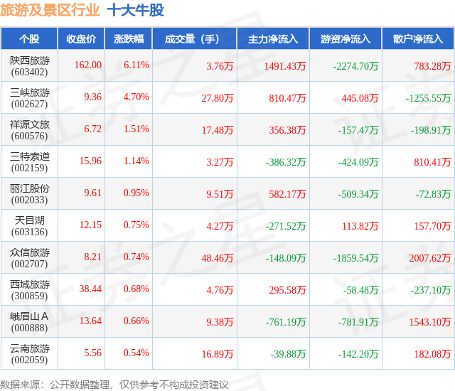 个股表现方面,旅游及景区行业当日领涨股为陕西旅游(603402),该股当日报收162.0,上涨6.11%,成交量3.76万,主力资金净流入1491.43万元。三峡旅游(002627)以上涨4.7%紧随其后,该股当日成交量27.8万,主力资金净流入810.47万元。除此之外,祥源文旅(600576)、三特索道(002159)、丽江股份(002033)均进入当日牛股之列。具体个股列表见下表: