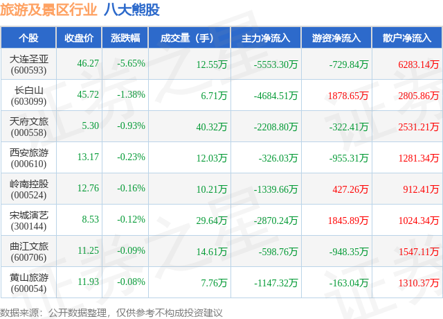 个股表现方面,旅游及景区行业当日领跌股为大连圣亚(600593),该股当日报收46.27,下跌5.65%,成交量12.55万,主力资金净流出5553.3万元。长白山(603099)以下跌1.38%紧随其后,该股当日成交量6.71万,主力资金净流出4684.51万元。除此之外,天府文旅(000558)、西安旅游(000610)、岭南控股(000524)均进入当日熊股之列。具体个股列表见下表:
