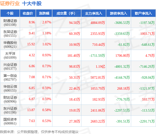个股表现方面,证券行业当日领涨股为财通证券(601108),该股当日报收8.96,上涨2.87%,成交量94.5万,主力资金净流入4884.09万元。东吴证券(601555)以上涨1.18%紧随其后,该股当日成交量60.39万,主力资金净流入2355.93万元。除此之外,华鑫股份(600621)、太平洋(601099)、兴业证券(601377)均进入当日牛股之列。具体个股列表见下表: