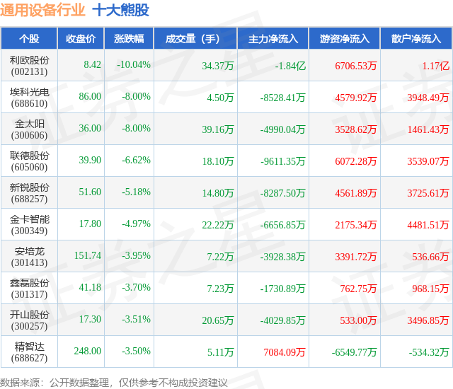 个股表现方面,通用设备行业当日领跌股为利欧股份(002131),该股当日报收8.42,下跌10.04%,成交量34.37万,主力资金净流出1.84亿元。埃科光电(688610)以下跌8.0%紧随其后,该股当日成交量4.5万,主力资金净流出8528.41万元。除此之外,金太阳(300606)、联德股份(605060)、新锐股份(688257)均进入当日熊股之列。具体个股列表见下表: