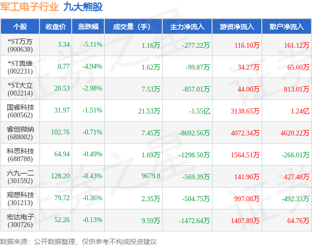 个股表现方面,军工电子行业当日领跌股为*ST万方(000638),该股当日报收3.34,下跌5.11%,成交量1.16万,主力资金净流出277.22万元。*ST奥维(002231)以下跌4.94%紧随其后,该股当日成交量1.62万,主力资金净流出99.87万元。除此之外,*ST大立(002214)、国睿科技(600562)、睿创微纳(688002)均进入当日熊股之列。具体个股列表见下表: