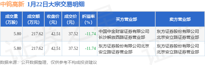 证券之星消息,1月22日中钨高新发生大宗交易,交易数据如下: