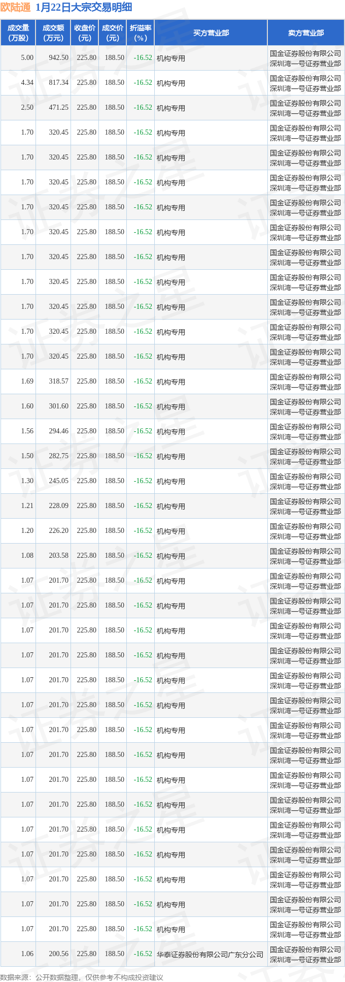 证券之星消息,1月22日欧陆通发生大宗交易,交易数据如下: