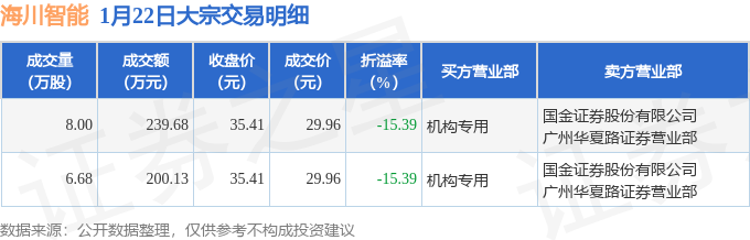 证券之星消息,1月22日海川智能发生大宗交易,交易数据如下: