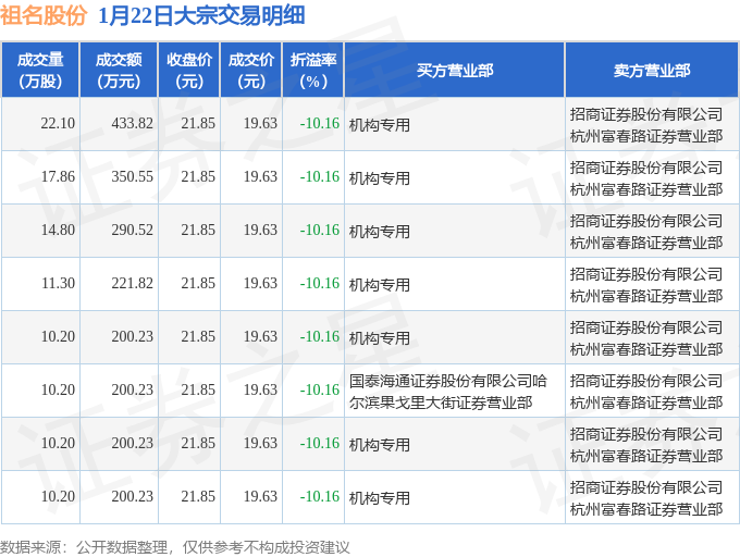 证券之星消息,1月22日祖名股份发生大宗交易,交易数据如下: